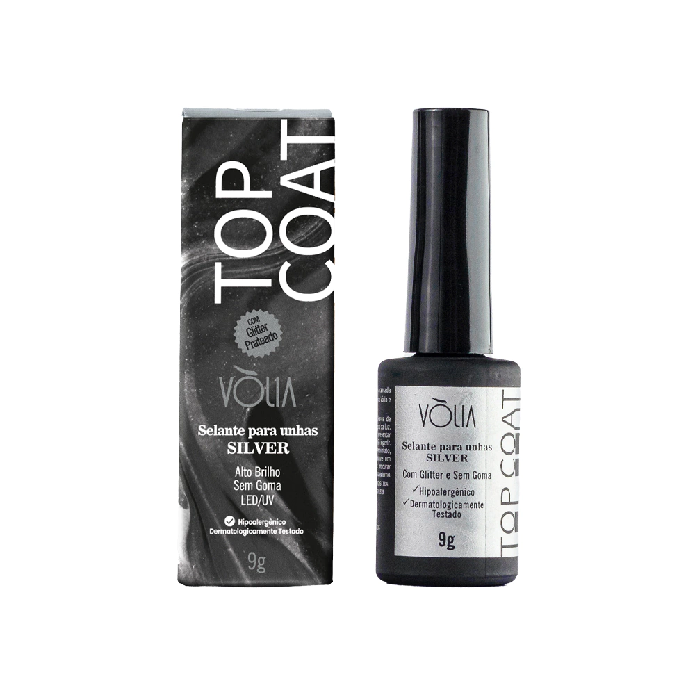 O Top Coat Silver Vòlia (9g) é o finalizador sem goma com glitter prateado para unhas, que atua como um selante em gel para proporcionar maior durabilidade, brilho e resistência.